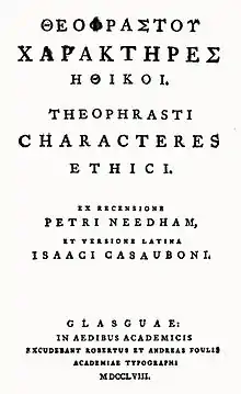 - Θεουφραστου Χαρακτηρες Ηθικοι. Theophrasti Characteres Ethici Græce et Latine, Cantab. Typ. Acad., printer Cornelius Crownfield, 1712. Edition of the Characters of Theophrastus, with the notes of Isaac Casaubon, and the Prælectiones of James Duport, which Needham printed for the first time. It extended to nearly five hundred pages, and was dedicated to John Moore. This edition was reissued at Glasgow by Robert Foulis in 1743, 1748, and 1785, without the Prælectiones.