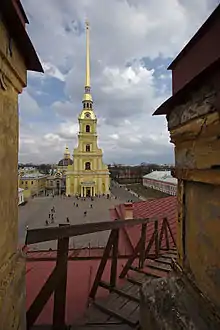 The Peter and Paul Cathedral (Russian: Петропавловский собор, romanized: Petropavlovskiy sobor) is a Russian Orthodox cathedral located inside the Peter and Paul Fortress in St. Petersburg, Russia. It is the first and oldest landmark in St. Petersburg, built between 1712 and 1733 on Hare Island along the Neva River. Both the cathedral and the fortress were originally built under Peter the Great and designed by Domenico Trezzini. The cathedral's bell tower is the world's tallest Orthodox bell tower. Since the belfry is not standalone, but an integral part of the main building, the cathedral is sometimes considered the highest Orthodox Church in the world. There is another Cathedral of Saints Peter and Paul Church in St. Petersburg, located in Petergof.