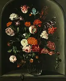 An important portion of van Kessel's output is constituted by floral still lifes. An example is the Floral still life in a niche with a stag beetle (at Hampel Munich sale of 30 March 2017 lot 263<) which shows flowers in a glass vase set in a stone gray niche. The flowers do not reach outside of the niche. The glass vase stands at the very edge of the niche. A stag beetle is about to climb the wall recess and unto to the ledge on which the vase stands. The painter has arranged the flower container in the vase in such a way that all flowers, including roses, tulips, carnations, marigolds and other garden flowers are equally lit up in front of the dark niche wall. Probably as a vanitas reminder (discussed below), the stems or petals of the hollyhock on the right and the nasturtium on the left are shown already drooping slightly.[7] This type of painting is very reminiscent of the still life in a niche paintings of earlier Flemish artists such as Osias Beert.[8]