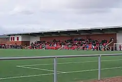 The stadium can also hold up to 2,000 spectators, with one stand (known as the main stand) containing 500 seats. This stand is attached to the club building, containing a bar, a function room, gymnasium, dance studio and health suite. Opposite the main stand is two steps of terracing, with a business centre located next to the right side of the main stand. To the left of the main stand, is more terracing. The centre also has a full-size football pitch, plus a number of 5-a-side pitches.