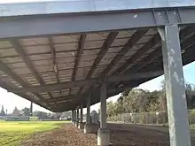Entering from the large parking lot, 3 gyms are visible, the "Big Gym", the "Small Gym", and the "Mini Gym". Behind are locker rooms, a workout room, and 2 swimming pools. Straight ahead are 8 fenced tennis courts, a large asphalted area with 10 basketball courts, 3 tennis walls, and a fitness center.[4] The 1/4 mile track is elevated 5 feet, and to the right of it are bleachers. An 8.3 acre field with 2 solar panel arrays and a 11.3 acre farm exist west of the track.[4]
