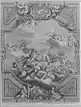 | Petite galerie – view of the central ceiling vault, engraving by Simon Thomassin (1655-1733) after Pierre Mignard (1612-1695), late 17th century | Deuxième salon de la Petite galerie – view of the ceiling vault, engraving after Pierre Mignard (1612-1695), late 17th century | Salon de l'abondance detail of the ceiling depicting Louis XIV's nef that was housed in the cabinet des médailles, René-Antoine Houasse (1645-1710), 1683 |