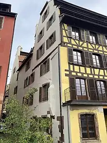 The origin of the name Petite-France ("Little France") was not given for patriotic or architectural reasons. It can be found in the Alsatian name Blatterhüs of a hospice for the incurable, originally founded in the Finkwiller district and then moved in 1687 to a new building at 6 rue des Moulins, on what is now the Quai de la Petite-France (Blodergängel in Alsatian during the 18th and 19th centuries), where it operated for a period of almost 300 years until 1789 in the then German-speaking and culturally German-influenced Lutheran University City of Strasbourg. Until 1789, all of Alsace was a foreign country under customs law (province à l'instar de l'étranger effectif), i.e. it had a customs border with France, but not with the Holy Roman Empire. The hospice was founded in 1503 by Gaspard Hofmeister, a citizen of the city, for the Landsknechte of Charles VIII of France, who had contracted syphilis during the Italian wars. The return of the Landsknechte from the siege of Naples brought syphilis to the region. The hospice had been expanded in 1506 and 1522 before being moved in 1687. Syphilis is a disease that appeared suddenly in Europe at the end of the 15th century and soon required considerable care for the often marginalized patients. The population called the hospice "Zum Französel" at the time - syphilis was considered a "French disease". In the 18th century the place was called the Hospice of the Incurable. In 1795 the building was referred to as "La Petite France", then by extension the entire district.[8][9]