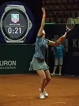 After dropping her opening match in Stuttgart to Madison Brengle,[113] Kvitová sailed into the quarterfinals in Madrid with wins over Olga Govortsova, Coco Vandeweghe and Anastasia Pavlyuchenkova. She then advanced to the semifinals after dispatching Irina-Camelia Begu in straight sets, setting up a clash with world No. 1, Serena Williams. She had not beaten Williams in five previous attempts but upset the American in straight sets to advance to her second Madrid final. The win also ended Williams' 27-match winning streak dating back to the WTA Finals the previous year.[114] In the final, she defeated Svetlana Kuznetsova in a dominating performance to claim her 16th career title.[115] The following week in Rome, Kvitová cruised into her second quarterfinal here but lost to Suárez Navarro for the third time this year.[116] Seeded fourth at the French Open, she defeated Marina Erakovic, Sílvia Soler Espinosa and 30th seed Begu to reach the fourth round of a Grand Slam tournament outside of Wimbledon for the first time since the 2012 US Open. There, she was upset by 24th seed Bacsinszky in three sets.[117] Nevertheless, following the tournament's conclusion, Kvitová returned to the world No. 2 ranking for the first time since February 2012.[11]