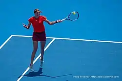 Kvitová began 2013 at the Brisbane International. Seeded sixth, she bowed out in the second round to eventual runner-up Anastasia Pavlyuchenkova.[61] She then dropped her opening match in Sydney to Dominika Cibulková.[62] Kvitová was the eighth seed at the Australian Open. She moved past Francesca Schiavone in the first round in three sets. In the second round, however, she struggled against Laura Robson and eventually succumbed to the Brit in three sets.[63] Kvitová was then awarded a wildcard into the Open GdF Suez. She defeated Stefanie Vögele to reach the quarterfinals where she was upset by Kristina Mladenovic in straight sets. In the opening round of Fed Cup, where the Czech team faced Australia, Kvitová started with a win in singles over Jarmila Gajdošová and followed it up with a three-set victory over Samantha Stosur, saving a match point in the process. The Czechs then advanced to the semifinals with a 4–0 scoreline.[64]