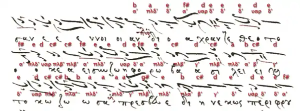 His reputation―as an important teacher and composer―is mainly based on his vast contributions concerning the Heirmologion (Katavaseion or Heirmologion argon, printed the first time in transcription in 1825) and the short or simple Sticherarion (Doxastarion syntomon, printed the first time in transcription in 1820).[10] These innovations of Orthodox chant had been written during his last years and parts of it were likely continued by his second domestikos Petros Byzantios who followed him as lampadarios, but also as teacher at the New Music School of the Patriarchate. According to Chrysanthos, Petros Peloponnesios' realisations for the Anthology of the Divine Liturgies (like the Papadic cherubikon, and koinonikon cycles) were already written, while he was still second domestikos and not supposed to contribute with own compositions.[11] Petros composed two cycles of cherubika for the weekdays, unlike other composers who composed in all eight echoi, his cycles follow the order of the weekly koinonika (protos for Monday, varys for Tuesday, tetartos for Wednesday, plagios tetartos for Thursday, and plagios protos for Friday). Later as lampadarios, Petros did not simply transcribe and contribute to the new hyphos created by his masters Ioannes and Daniel, he also studied the Byzantine tradition as well as innovative Protopsaltes of the Ottoman period like Petros Bereketis.[12] Although it is not clear, whether Georgios Papadopoulos was right that Petros stole makam music, since the author rather compiled earlier Ottoman anecdotes in his biography of Petros, the latter had a certain reputation to usurp the contribution to the hyphos by other composers like Ioannes the Protopsaltes and Daniel the Protopsaltes as his own work, especially of those he was charged to transcribe as a second domestikos.[13] Sometimes he simply pointed at the hyphos project he shared with Daniel the Protopsaltes and other students of Ioannes. He did not write down the background of a traditional melos as was the traditional synoptic use of notation, but also details of a personal realisation like in case of the doxastikon of Kassia's troparion, which he specified "in imitation of Daniel the Protopsaltes".