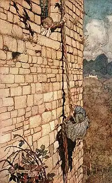 An illustration of "Rapunzel", a tale inspired by "Petrosinella", by Arthur Rackham (1909)