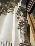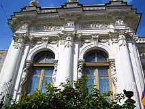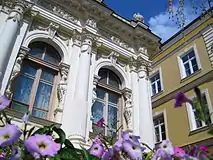 The Petrov Mansion is built in an eclectic style; its design combines baroque, classical and renaissance motifs. The main (southern) façade facing Pushkinskaya Street has an asymmetric composition. The walls of the main floor are decorated with columns of the composite order. Window openings have semi-circular ends with capstones. Archivolts are based on caryatids. Over the main entrance is a heraldic sign. The frieze above the windows is richly decorated with stucco elements: female heads, griffins, cartouches, and floral ornaments. On the balustrade there is a row of balusters and pedestals.[3]