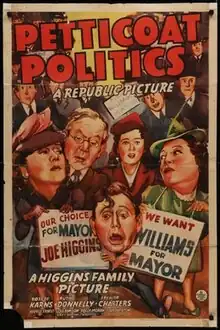 Petticoat Politics is a 1941 American comedy film directed by Erle C. Kenton and starring Roscoe Karns, Ruth Donnelly and Spencer Charters.[1] It was the ninth and final of Republic's Higgins Family series.