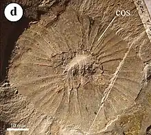 The first was a detached frontal appendage of Anomalocaris, described by Joseph Frederick Whiteaves in 1892 as a phyllocarid crustacean, because it resembled the abdomen of that taxon.[7] The first fossilized oral cone was discovered by Charles Doolittle Walcott, who mistook it for a jellyfish and placed it in the genus Peytoia. In the same paper, Walcott described a poorly-preserved body specimen as Laggania; he interpreted it as a holothurian (sea cucumber). In 1978, Simon Conway Morris noted that the mouthparts of Laggania were identical to Peytoia, but interpreted this as indicating that Laggania was a composite fossil of Peytoia and the sponge Corralio undulata.[8] Later, while clearing what he thought was an unrelated specimen, Harry B. Whittington removed a layer of covering stone to discover the unequivocally connected arm thought to be a phyllocarid abdomen and the oral cone thought to be a jellyfish.[9][7] Whittington linked the two species, but it took several more years for researchers to realize that the continuously juxtaposed Peytoia, Laggania and frontal appendage represented one enormous creature.[7] Laggania and Peytoia were named in the same publication, but Conway Morris selected Peytoia as the valid name in 1978, which makes it the valid name according to International Commission on Zoological Nomenclature rules.[8][10]