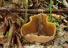 Peziza arvernensis, commonly known as the Boring Brown Cup Fungus or Fairy Tub,[2]is a species of apothecial fungus belonging to the family Pezizaceae. This fungus appears as brown cups, often in small groups, on soil in broad-leaved woodland, especially with beech. The ascocarps can grow quite large, up to 10 cm (3+7⁄8 in) across. This species is widespread in Europe with a few records from North and South America.