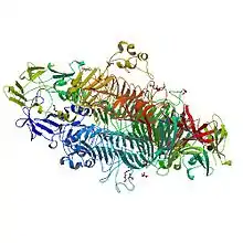 11. Steinbacher S, Seckler R, Miller S, Steipe B, Huber R, Reinemer P (Jul 1994). "Crystal structure of P22 tailspike protein: interdigitated subunits in a thermostable trimer". Science. 265 (5170): 383–386. Bibcode:1994Sci...265..383S. doi:10.1126/science.8023158. PMID 8023158.