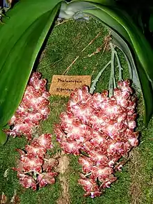Phalaenopsis gigantea is a species of orchid endemic to the island of Borneo and was first described in 1909.[1] The specific epithet gigantea refers to the giant size of its leaves, which can grown over 60 cm in length on a mature plant. It is the largest known Phalaenopsis species.[2]