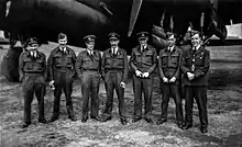 After his first tour ended flying Stirlings with 218 Squadron, Lamason then instructed other pilots at 1657 Heavy Conversion Unit.[9] Returning to operations with No. 15 Squadron RAF, Lamason was twice Mentioned in Despatches, first on 2 June 1943 and again, having received promotion to acting squadron leader, on 14 January 1944.[10][11] He was awarded a Bar to his DFC on 27 June 1944, for "courage and devotion to duty of a high order" and "vigorous determination" in attacks on Berlin and other heavily defended targets.[4][5][12] Lamason was presented his award after the war by King George VI at Buckingham Palace, where he met and befriended a young Princess Elizabeth.[13][14] A day after making an emergency landing at an American base in England, Lamason was introduced to, shook hands and spoke with Clark Gable.[3]