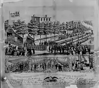 In June 1864, the Philadelphia division of the United States Sanitary Commission organized a large fair to raise money to buy bandages and medicine. The Great Central Fair lasted two weeks and was held in temporary buildings covering several acres of Logan Square. Thousands of works of art were lent for display, and many were donated for auction. Among the visitors was Lincoln.[10] The Sanitary Fair raised $1,046,859.[11]