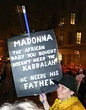 A woman showing disapproval of Madonna's 2006 adoption (of David Banda)