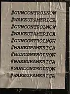 Among her many posts regarding concerns with school shootings and gun control, she expressed that she felt a "responsibility to the children of the world".[119] By April 2021, Madonna had invited her audience to join the campaign of Everytown for Gun Safety,[120] and she was later seen posting wheat paste stickers with messages about gun control on Los Angeles streets. Various people noted her efforts, including actor Peter Stickles.[121] In May 2022, she shared a lengthy post after the Texas shooting at the Robb Elementary School demanding a "Gun Reform" from lawmakers, calling out to the National Rifle Association.[122][123]