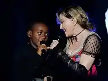 Madonna next to her first adopted child, David Banda seen on stage during the 2015 Rebel Heart Tour