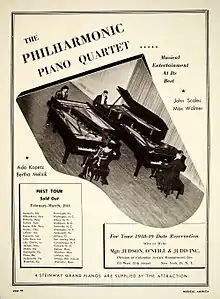 The quartet was formed in 1948 when they made the first of their several tours of the United States under the sponsorship of Columbia Artists Management. They made their official New York City debut in a concert at Lewisohn Stadium on June 25, 1949. The ensemble also appeared in syndicated radio broadcasts of ABC's Piano Playhouse and made two LP recordings for the Columbia Masterworks label in 1949 and 1950.[1][2][3][4][5]