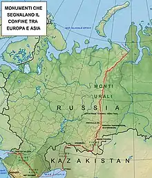 Starting from the first half of the nineteenth century, about a hundred monuments were installed on the conventional Europe-Asia border based on von Strahlenberg's line, modified with the substitution of the Ural river in place of the Emba river. The first was that of Pervouralsk, built in 1837 on Mount Berezovaja, about which the famous writer Dostoevsky also wrote.[9] The most notable are the following.[10]