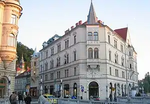 The two buildings were designed after the 1895 Ljubljana earthquake by the Graz architect Leopold Theyer and completed in 1898. The mansion was built by the tradesman Filip Schreyer.[1] Philip Mansion is distinguished by a Renaissance Revival style.[1] It is said that small spires on its façades were built at the explicit demand of the Mayor Ivan Hribar, who was an admirer of Czech culture and wanted Ljubljana to resemble Prague, the "city of a hundred spires". However, the more probable explanation is that the spires were meant to serve as a reminder of the town gates in the old defensive wall that stood in their place.[2]