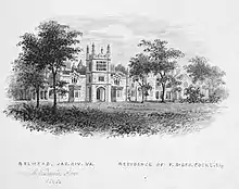 Philip St. George Cocke owned large plantations in several Virginia counties, including Powhatan, Surry and Brunswick Counties, as well as cotton plantations in Mississippi. He used enslaved labor on all his plantations. In 1835, Philip St. George Cocke commissioned architect A.J. Davis to build a manor house named "Belmead" in Powhatan County.[4] In 1840, Cocke owned 30 slaves in Surry County, 125 slaves in Brunswick County and 82 slaves in Powhatan County.[5] The numbers grew by 1850 to 118 slaves in Powhatan County, 45 in the southern district of Brunswick County, and 187 slaves in Lowndes County, Mississippi.[6] In 1860, Cocke owned 124 slaves in Powhatan County, at least 33 in Yazoo County, Mississippi and possibly another 39 in Holmes County, Mississippi and 52 in Fluvanna County, Virginia.[7]