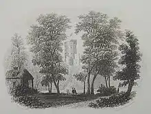 The Prince's Tower, d'Auvergne's gothic residence, as depicted by Philip John Ouless in 1855