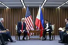 The Philippines–United States relations refers to the bilateral and diplomatic relations of the Republic of the Philippines and the United States of America. The relationship between the United States and the Philippines has been historically strong; often described as a "special relationship,"[1][2] originating from the fact that the Philippines was a colony of the United States between 1898 and 1946. The former Philippine president Rodrigo Duterte, however, was supportive of a foreign policy that was less dependent on the United States, favoring one that prioritized closer relations with China and Russia,[3] despite the Philippines and the U.S. having a mutual defense treaty dating from 1951 to the present. In 2014, the countries signed an enhanced defense cooperation agreement that began its first phase of implementation in 2019.