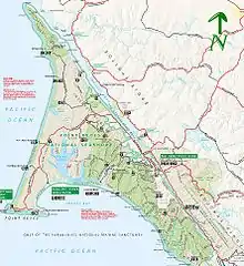 The Phillip Burton Wilderness is part of the 111 sq. mile (288 km2) Point Reyes National Seashore located about 20 miles (32 km) northeast of San Francisco, California. Total wilderness land is 33,373 acres[1] which includes a roadless "potential wilderness" area of over 8,000 acres (32 km2) and is one of only three designated wilderness along the California coast, the others being the King Range Wilderness and the Rocks and Islands Wilderness. The National Park Service manages the wilderness.