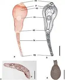Philophthalmus gralli, commonly known as the Oriental avian eye fluke, parasitises the conjunctival sac of the eyes of many species of birds, including birds of the orders Galliformes and Anseriformes.[2] In Brazil this parasite was reported in native Anseriformes species.[3] It was first discovered by Mathis and Leger in 1910 in domestic chickens from Hanoi, Vietnam.[1] Birds are definitive hosts and freshwater snail species are intermediate hosts (e.g. Tarebia granifera and Melanoides tuberculata).[4] Human cases of philophthalmosis are rare, but have been previously reported in Europe, Asia, and America (i.e., Yugoslavia, Sri Lanka, Japan, Israel, Mexico, and the United States).