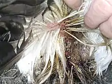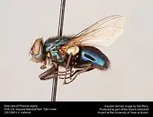 Phormia regina adults are metallic blue or green in color and have a distinctive set of orange setae near the anterior thoracic spiracle.[2] They are also recognizable by their black gena (the side of the head below eye level), mostly white calypteres, and the distinctive bend in their wings.[2][3]
