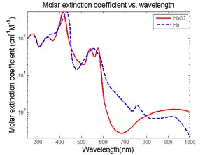 Fig. 2. Absorption spectra of oxy- and deoxy-hemoglobin.