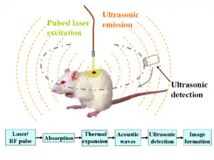 Photoacoustic imaging or optoacoustic imaging is a biomedical imaging modality based on the photoacoustic effect. Non-ionizing laser pulses are delivered into biological tissues and part of the energy will be absorbed and converted into heat, leading to transient thermoelastic expansion and thus wideband (i.e. MHz) ultrasonic emission. The generated ultrasonic waves are detected by ultrasonic transducers and then analyzed to produce images. It is known that optical absorption is closely associated with physiological properties, such as hemoglobin concentration and oxygen saturation.[1] As a result, the magnitude of the ultrasonic emission (i.e. photoacoustic signal), which is proportional to the local energy deposition, reveals physiologically specific optical absorption contrast. 2D or 3D images of the targeted areas can then be formed.[2]