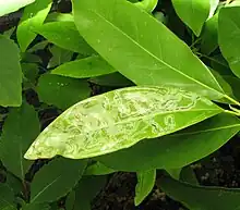 Magnolia leaf with mines made by P. magnoliella