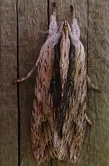 Male. — 45 mm. Head, palpi, thorax, and legs grey-whitish ; crown with two brown lines meeting in front ; palpi with second joint externally brown ; thorax with large anterior crest, two brown dorsal lines meeting in front, diverging and very indistinct posteriorly. Antennae grey, filiform, moderately ciliated. Abdomen grey, sides and anal tuft paler, and ochreous-tinged. Forewings moderately dilated, costa straight, apex obtuse, hind-margin crenulate, obliquely rounded ; pale ochreous-grey, densely and suffusedly irrorated with white, tending to form longitudinal streaks ; inner margin suffused with brownish ; lines hardly traceable, strongly dentate ; reniform narrow, white, anteriorly suffused, posteriorly edged with an interrupted blackish line ; subterminal indicated by a posterior brownish dentate margin, diverted to hindmargin below apex : cilia ochreous-grey, mixed with white. Hindwings rather dark grey ; cilia whitish, with a grey line.[1]