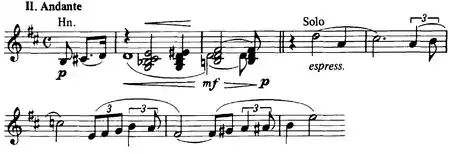 This contrast with the later works can be heard from the opening bars, where a brass fanfare precedes a flourish of double octaves and chords on the piano – a musical gesture similar to the Schumann and Grieg piano concertos. This flourish occurs later in the movement, as well, an important factor in the symmetry of the movement. The main theme (like the other themes in this work common to both versions) is short by Rachmaninoff's standards but already shows the sequential devices and arch-like design inherent in his later works.[2]
