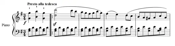 The Piano Sonata No. 25 in G major, Op. 79, was composed by Ludwig van Beethoven in 1809. It is alternatively titled "Cuckoo" or "Sonatina," and it is notable for its shortness.[1] A typical performance lasts only about nine minutes.[2] The work is in three movements: a fast-paced Presto alla tedesca, a slower Andante, and a lively Vivace.