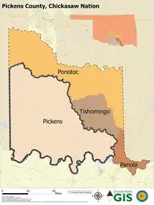 A constitution promulgated on Aug. 30, 1856 established the new Chickasaw government and its counties of Panola, Pickens, Pontotoc and Tishomingo. A Chickasaw Senate law on Oct. 5, 1859 set their boundaries definitively.[6]
