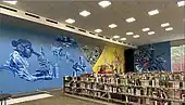 Yatika Starr Fields' 100' x 20' mural in the Pickens Learning Commons includes several different scenes from Northern Oklahoma College including a woman looking through a microscope, show lambs, another woman looking through a stack of books, men in space looking through VR systems, NOC’s mascot, Mav the bull, the Roustabouts, and the different performing arts. "These all flow in a beautiful display of colors and an incredible show of knowledge."[8]