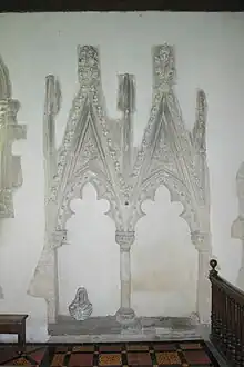 The chapel of Saint Nicholas in Piddington is known to have existed by 1309. It is now Piddington's Church of England parish church. Its Early English chancel was built in about 1300,[3] but has ornate Decorated Gothic sedilia and Easter Sepulchre carved in about 1350.[4] There is a canonical sundial on the south wall. In the 14th century the Decorated Gothic south aisle was added, with a four-bay arcade and some new two-light windows, but also re-using two Early English lancet windows presumably from the south wall of the nave.[3][4]