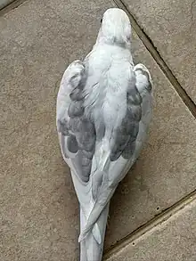 Pied cockatiels have large, random blotches of colour on their bodies, after the "normal grey" or "wild type" of a cockatiel's plumage is primarily grey with prominent white flashes on the outer edges of each wing.