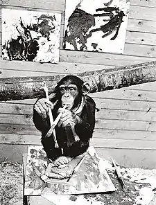 "Pierre Brassau" was Peter, a four-year-old common chimpanzee from Sweden's Borås Djurpark (i.e., Borås Zoo, condensed to "Brassau").[2] Axelsson had persuaded Peter's 17-year-old keeper to give the chimpanzee a brush and paint. After Peter had created several paintings, Axelsson chose the best four and arranged to have them exhibited at the Gallerie Christinae in Göteborg, Sweden.[1]