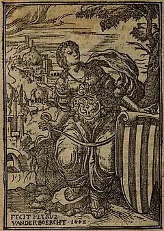 The first published work of art attributed to Pieter van der Borcht (I) was printed in 1552 by Jacob van Liesvelt's son Hans van Liesvelt II in a book written by Frans Vervoort entitled Dat vyants net, der booser wercken raet, visioenen ende met alder sijnder verholender stricken. The book contains 17 woodcut illustrations. The final illustration is an image of the Virgin Mary holding the symbol of the city of Mechelen and was signed "Fecit Petrus van der Boercht 1552".[4][8]