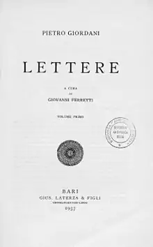 - Giordani, Pietro. Lettere, SI, 1937.