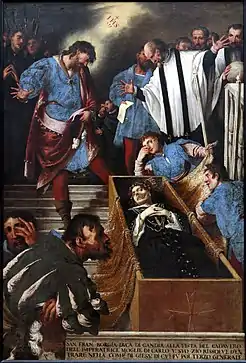 The influence of Bernardo Strozzi becomes noticeable in his work after 1630. This is apparent in the Angel Offering a Skull to St Giustina, who stands between St Joseph and St John (1640, Accademia, Venice) painted for the church of San Giustina. From 1640 to 1673 he painted designs for some the mosaic depictions inside the St. Mark's Basilica. A development towards greater drama was visible after 1650. The works of that time draw again on the Caravaggesque models he followed at the start of his career. The apex of this evolution is apparent in the two remaining works of the cycle of seven paintings that the artist executed between 1664 and 1674 for the second cloister of the Jesuit church in Venice. The paintings represent the Conversion of Francis Borgia (Musée des beaux-arts de Brest) and Marco Gussoni in the Ferrara lazaretto (location unknown). The macabre themes, the effects of spectral lights and the suffocating lack of space in the compositions are unique in Venetian painting of the seventeenth century, comparable only with the morbid paintings of the Milanese or Neapolitan schools. After this cycle his later paintings appear without inspiration and derivative from the painter's earlier works.[2] Of greater interest are some historical paintings of this period, which show in the bold brushstrokes and the bright and dazzling palette the influence of the leading 17th-century Venetian painter Francesco Maffei, who died in 1660. Other works of his later period show the influence of Giambattista Langetti and the group of tenebrosi active in Venice around 1660.[2]