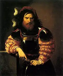 Della Vecchia was known for his paintings of soldiers (referred to as 'bravi') with broad feathered hats of which he made many versions and variations. Some of these paintings depict individual soldiers while others show soldiers in genre scenes such as fortune telling, playing dice etc.[10] The innumerable repetitions of these works depicting warriors and other popular figures created by his workshop had a negative impact on his posthumous reputation.[2] Della Vecchia painted not only imaginary portraits of bravos, but also of philosophers, pages and courtesans. These portraits are an expression of the Venetian Baroque's taste for eccentric subject matter. They also represent the artist's reaction to the expressive head portraits (tronies) by Caravaggio and Rembrandt.[14]