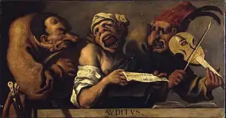 Della Vecchia had a notable interest in Venetian masters including Titian and Giorgione. This interest was likely nurtured during a stay as an assistant in the workshop of Padovanino. For his skill in imitating the works of Giorgione, his friend Marco Boschini coined for him the nickname 'simia da Zorzon', meaning 'ape of Giorgione'. Giorgione was called Zorzon in the Venetian dialect.[11] According to Boschini, della Vecchia abused of his skill in imitating the older Venetian masters. Boschini recounts that when the art dealer Francesca Fontana was assembling a collection for Cardinal Leopoldo de' Medici he was given a 'Giorgione self-portrait'. This portrait was actually an imitation by della Vecchia painted from his own features. When the deceit was discovered, della Vecchia claimed he was solely trying to emulate Giorgione and that he had produced the work 30 years earlier for his father-in-law Nicolas Régnier. Nicolas Régnier, who was not only a painter but also an art dealer, had sold the painting. Thirty years later, it was believed that the work was in fact a genuine Giorgione. It appears therefore that della Vecchia's imitations could very well be regarded in certain cases as attempts to pass off the imitations as originals.[12] His friend Boschini regarded these imitations, often executed in a remarkably ingenious manner, as displays of virtuosity. Other artists whose works della Vecchia and his workshop regularly imitated included Titian, Romanino, Palma Vecchio, Paris Bordone and Jacopo Bassano.[1][13] His imitations of Giorgione offer an important insight into the manner in which that artist's work was perceived in the 17th century. It is believed that none of della Vecchia's works in the style of Giorgione were based on now lost compositions of Giorgione but were 'original' creations in the style of Giorgione.[2]