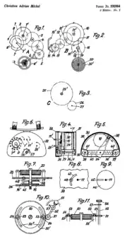 Thanks to research conducted by the Musée suisse de l'appareil photographique at Vevey, much more is known about the pigeon cameras developed at about the same time by the Swiss clockmaker Christian Adrian Michel (1912–1980)[29] in Walde. He was assigned to the Swiss Army's carrier pigeons service in 1931, and in 1933 he began work on adapting Neubronner's panoramic camera to 16 mm film, and improving it with a mechanism to control the delay before the first exposure and to transport the film between exposures. Michel's camera, patented in 1937,[30] weighed only 70 grams (2.5 oz), and may have been one of the first to have a timer operated by clockwork.[31]