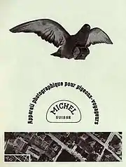 Despite the War Ministry's position immediately after the First World War, in 1932 it was reported that the German army was training pigeons for photography, and that the German pigeon cameras were capable of 200 exposures per flight.[24] In the same year, the French claimed that they had developed film cameras for pigeons as well as a method for having the birds released behind enemy lines by trained dogs.[25]