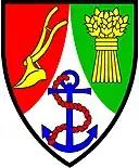 When a shield has more than one pile, and they are angled so that they touch at the base, they are described as piles in point. A few heraldry authorities from the Middle Ages such as Sir Thomas Holme and Nicholas Upton believed that whenever piles issued from the chief, they should automatically meet in point, but this view eventually fell out of favour and it has become common practice that unless otherwise specified, they should be drawn perpendicularly.[1] However, it is still possible to see examples of the previous school of thought.[2]
